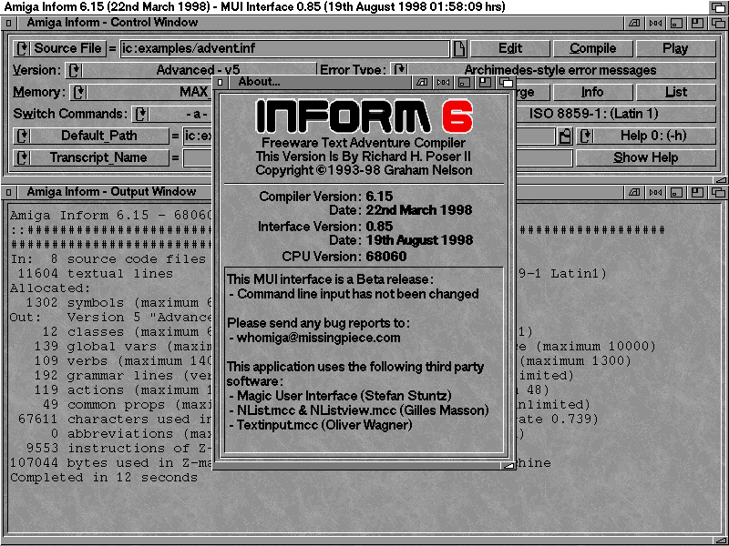 Inform for Amiga - Beta GUI Released! - Version 6.30 (040227) - Release Notes(pdf) - Library 6/11(040227) |